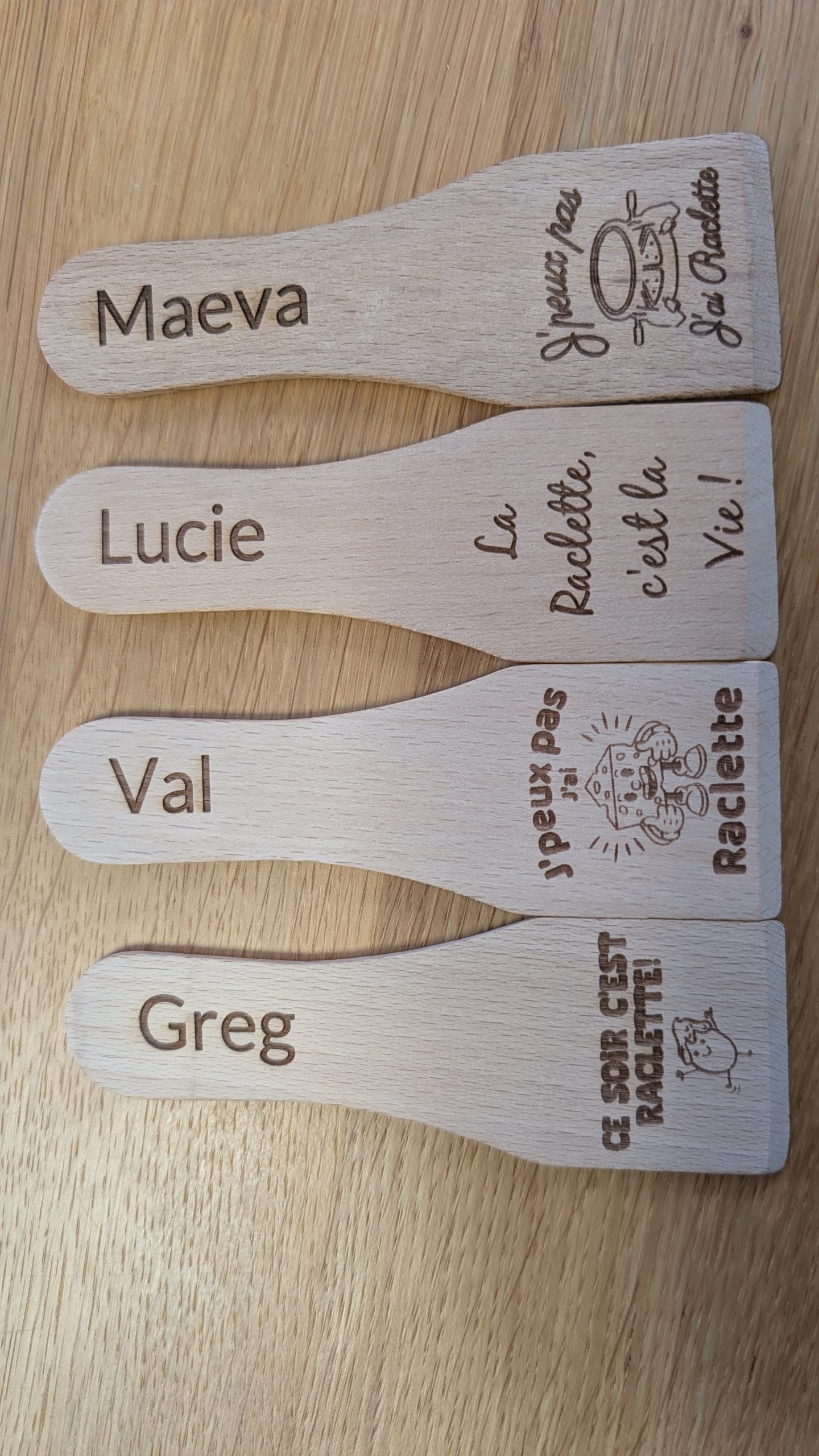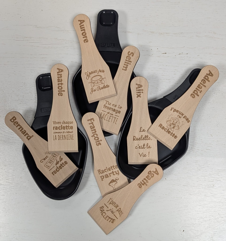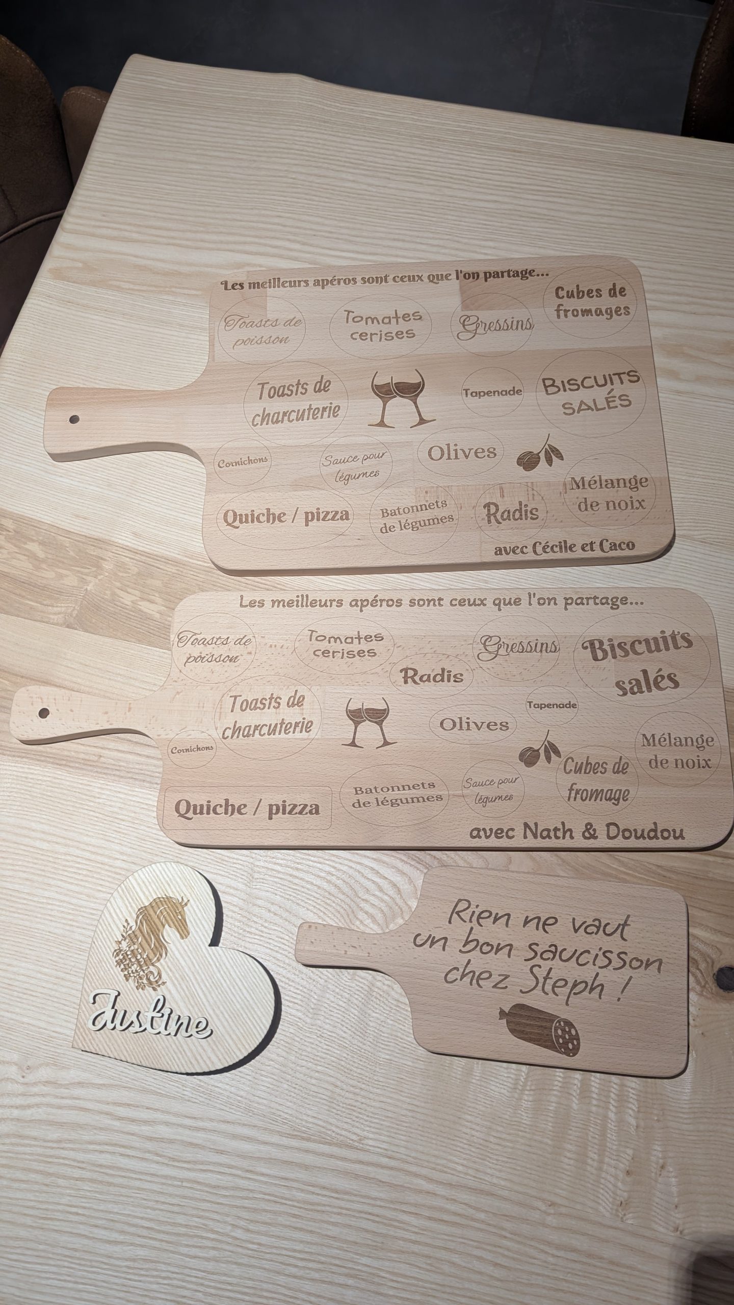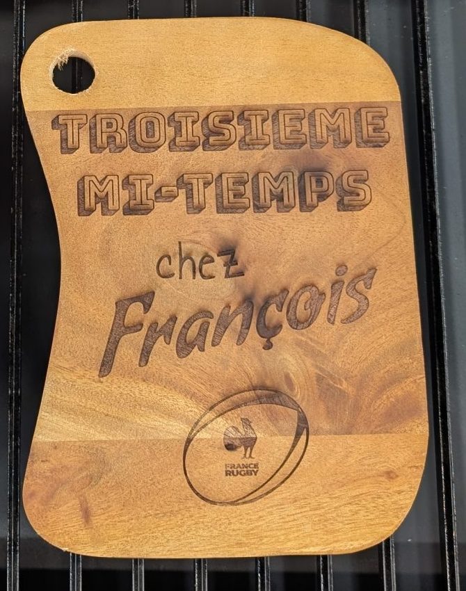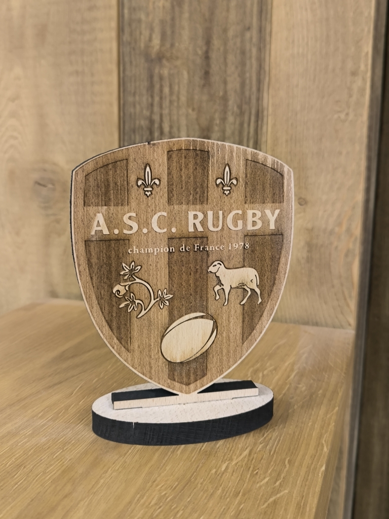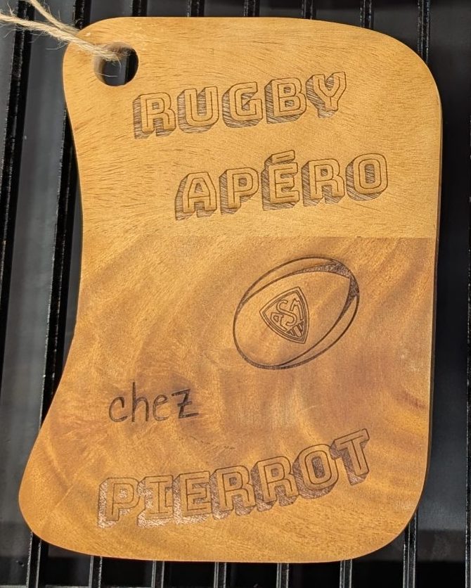 Nous proposons depuis peu des objets en bois gravés personnalisables, que ce soit des supports pour bouteilles, des prénoms pour porte de chambre, des décorations de votre équipe de rugby favorite et bien d’autres !